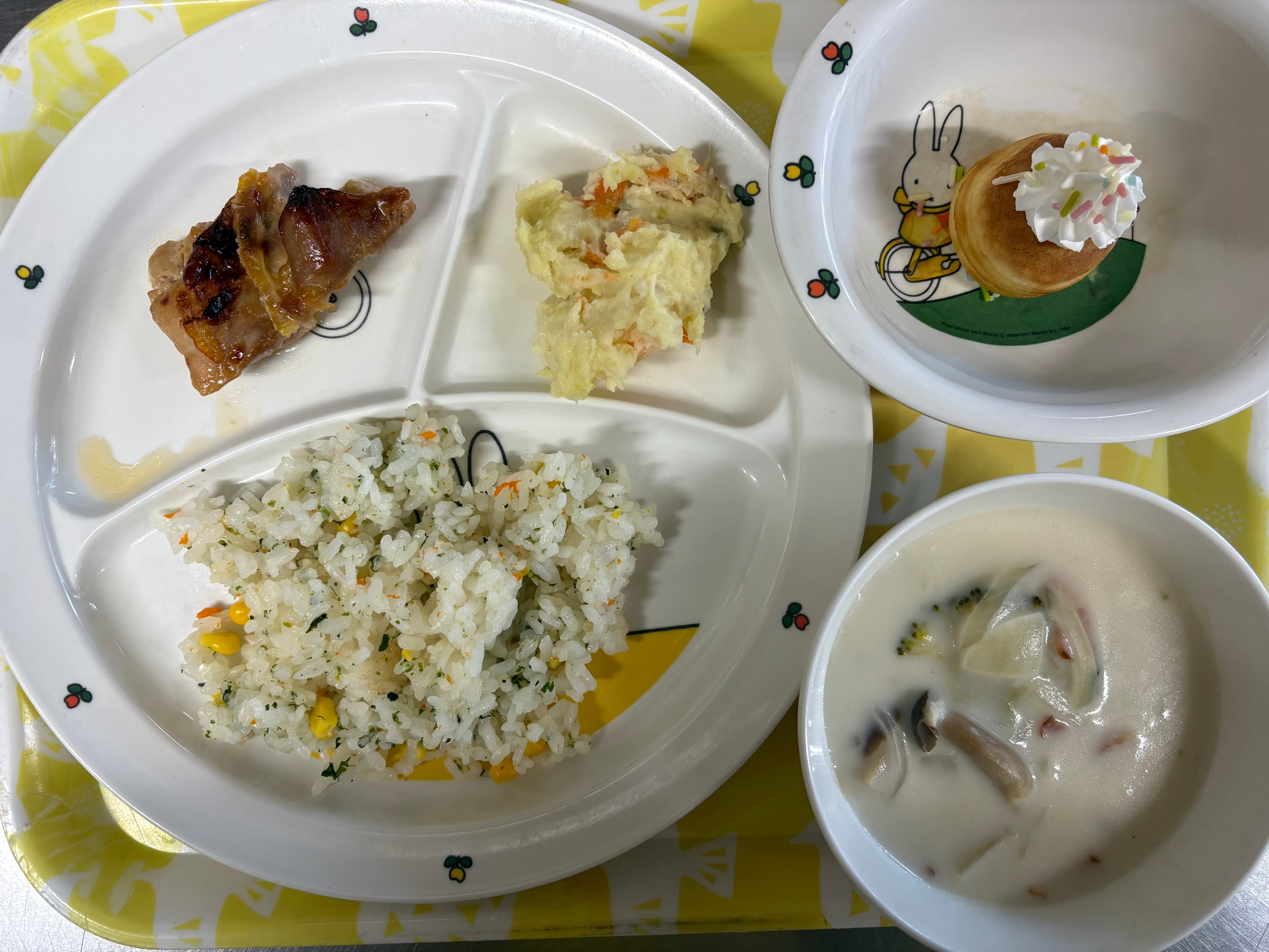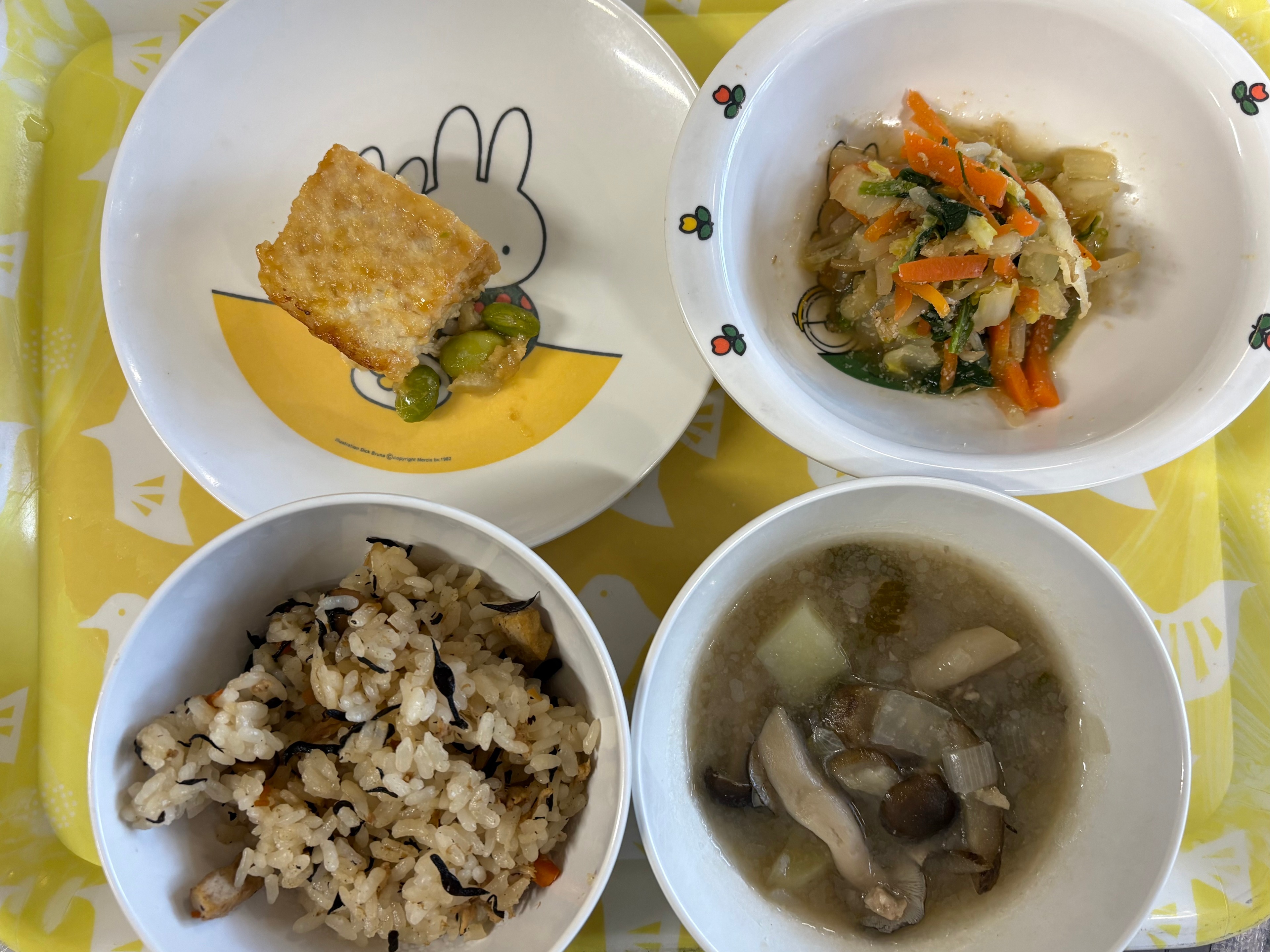カオル幼稚園の特色の一つに、園内の厨房で調理した給食を提供する『自園給食』の取り組みがあります。米飯給食を中心とした和食の多い献立で、野菜は主にカオル農園産のものを使用しています。収穫ラッシュの時期にはカオル農園産の野菜が使用野菜全体の8割を超えるほどで、ありがたい限りです。毎月行事食を設けるなどし、給食や食材からも季節の移り変わりを感じてもらえるよう努めています。
